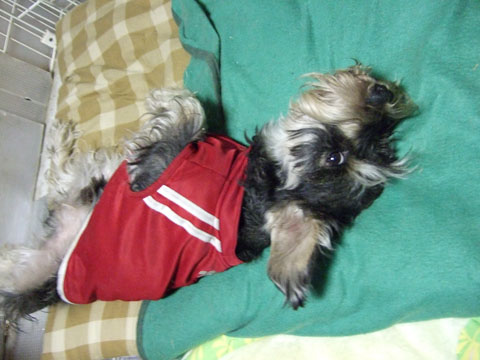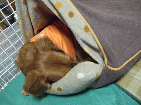 この寝床、袋状になっていて、ワンが自分で入れるようになっているんです。