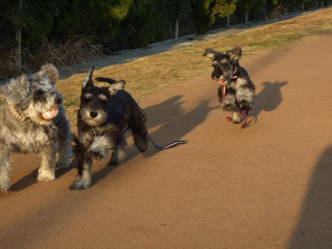 で、帰りもあんずのリードを持たせてもらい、がじろー、こすけ(仮)、あんずと3頭引きを楽しませてもらいました♪