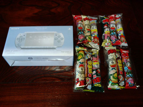500円で取った新型PSPと、無駄に1000円使ったうまい棒12本。