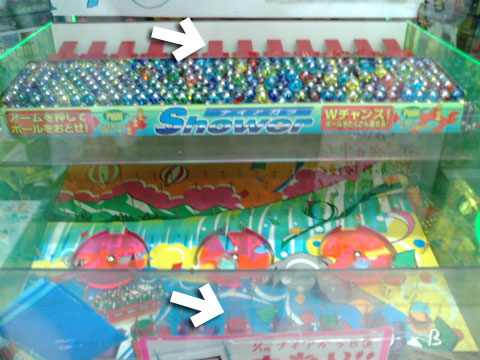 UFOキャッチャーのクレーンについた棒で、奥にある赤い板を押し込み、ビー玉を落としてスマートボールのようにゲートに入れるゲームです。