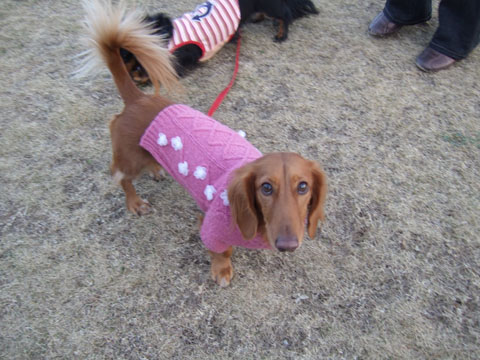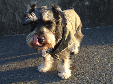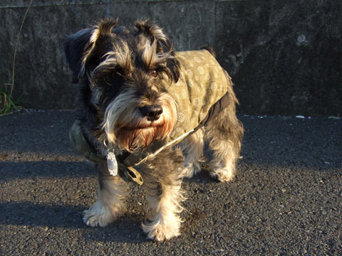 今日は比較的暖かかったんですが、昨夜も吐いたので念のため暖かい格好をと、ちゃんちゃんこで散歩。