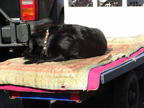 場外の店先に停めたターレットの上でお昼寝中のワン。
