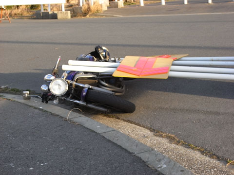 道路の案内板(土台は巨大コンクリート)が風に煽られバイクをなぎ倒してます。