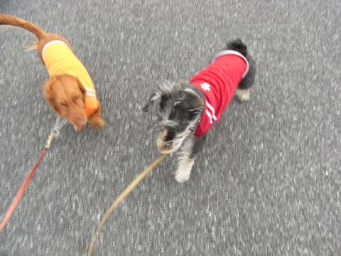 風で目が開けてられないがじろーと、毛が変な向きになってるこすけ。