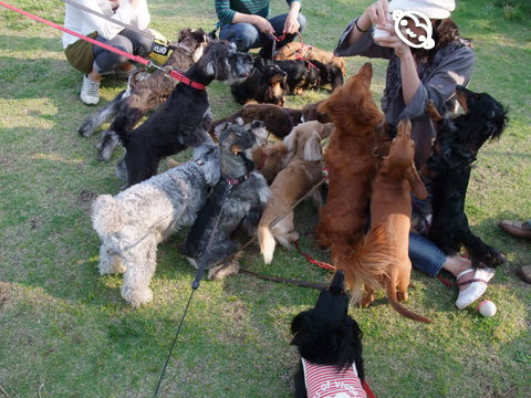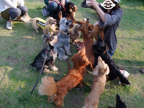 はなまるママにおやつをもらうため集まるダックス&シュナ。