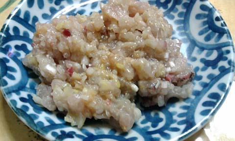 アジとネギ、しょうがを包丁で粘り気が出るまでたたき、なめろうを作ります。