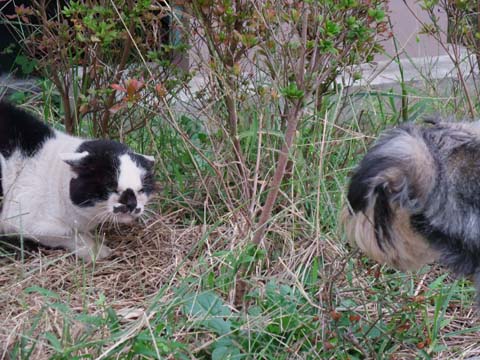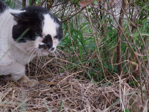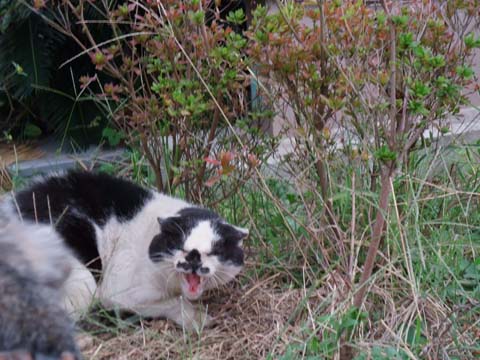 こすけがあまりにも近づくので、臨戦態勢のニャンコ先生。