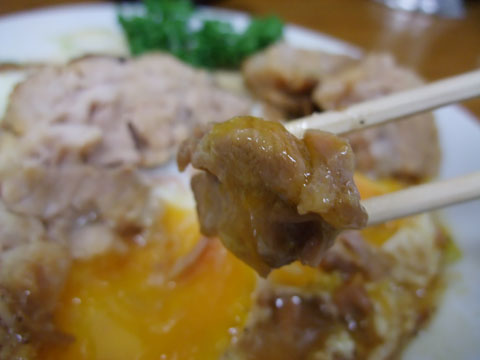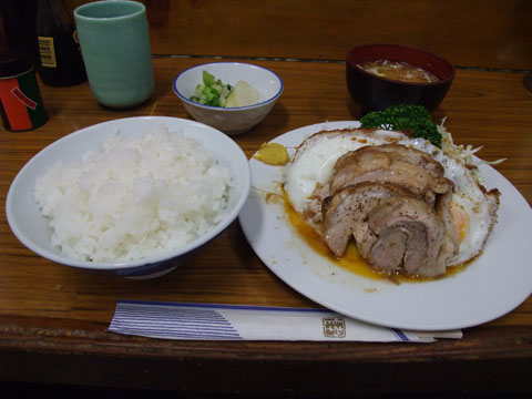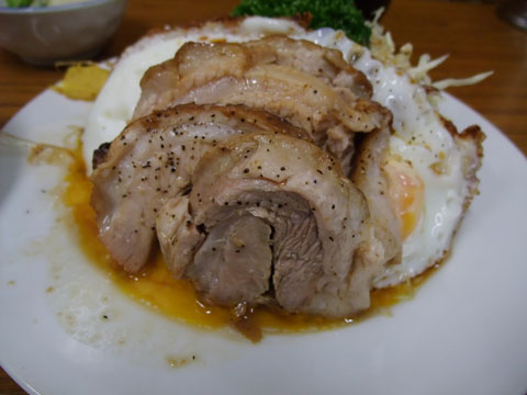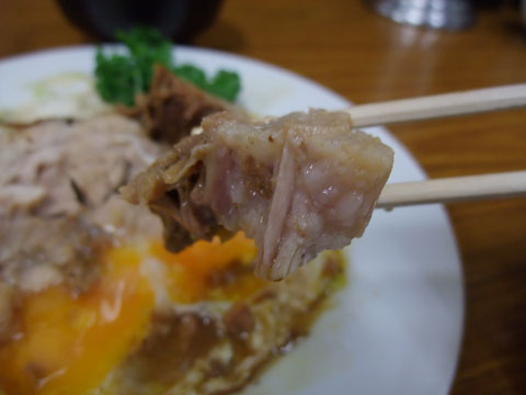 半熟の目玉焼きの上に、厚さ1cmはあるチャーシューが三枚乗ってます。