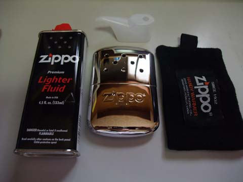 中身は、Zippoオイル、ハンディウォーマー本体、軽量カップ、専用フリース袋。