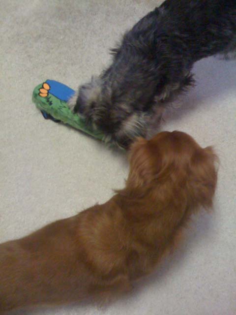 ペットボトルをかじるのが好きながじろーと、ぬいぐるみ大好きなこすけ。
