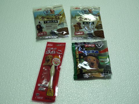 金の小粒シニアとレギュラー、MINCH SPECIALシニア、ほねっこ。