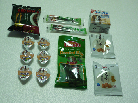 RED MILL'S、ペットの牛乳、ペットの牛乳ゼリー、INABAデンタルバー、デビフの豆乳クッキー。