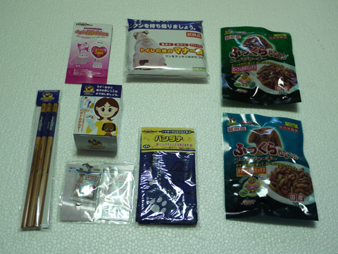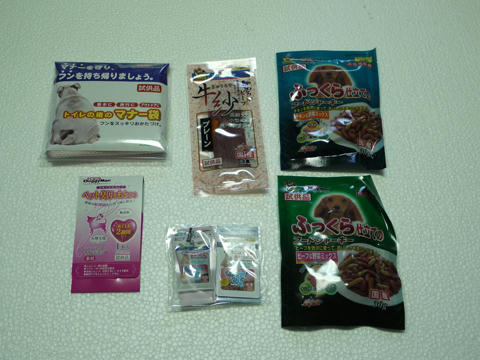 マナー袋、牛紗(ジャーキー)、ふっくら仕立のフードジャーキー(チキン&野菜ミックス)、薬用ペットデオドラント、ヘルシージャーキー365のストラップとマグネット、ふっくら仕立のフードジャーキー(ビーフ&野菜ミックス)。