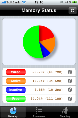 3GではメールやiPod、Safariを起動していると空きメモリはほとんどないんですが、3GSでは同じ状態でも余裕があります。