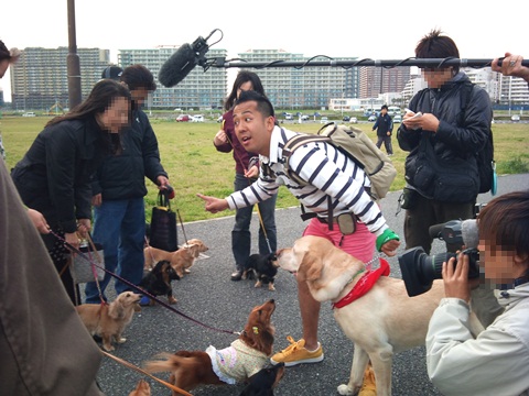 たくさんのワンと撮影しながら、高校生や子どもたちとも触れ合う松本くん。