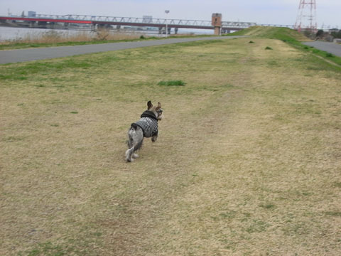 のんびり歩いていると、こすけはひとりでダッシュし始める。