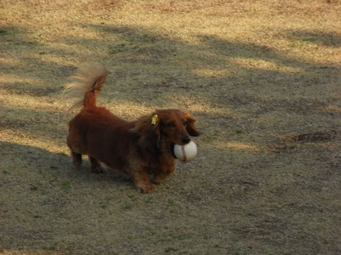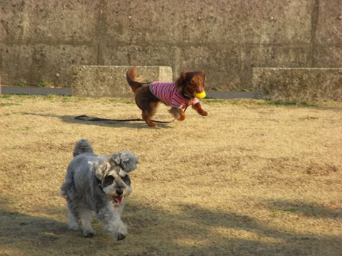 ボールをくわえて走っていただじょーを追いかけているうちにガウガウになったくるみ。