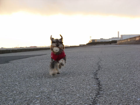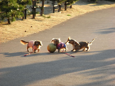 広い堤防散歩では、毎日こすけとボール遊びをします。
