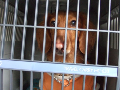 なぜがじろーがしっぽを振りながらのぞいているかというと、クレートに入れるときにご褒美のクッキーがもらえるから。