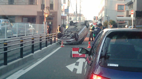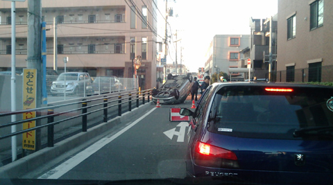 こんな狭い道路の交差点で、いったいどうやったらこんな風にひっくりかえるんだ?