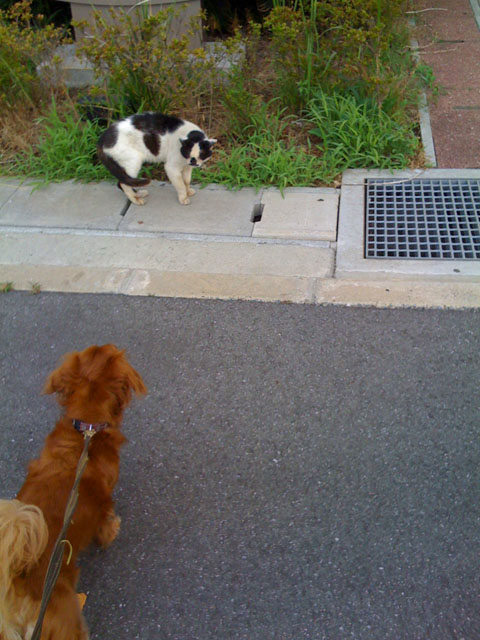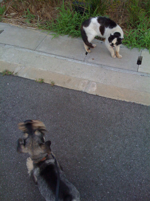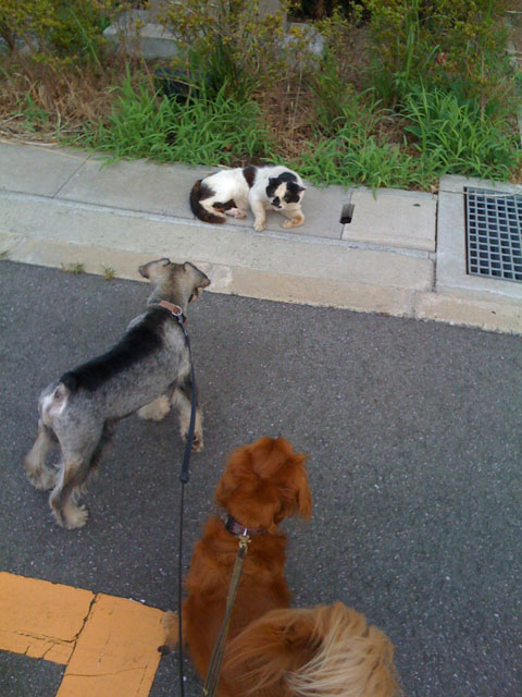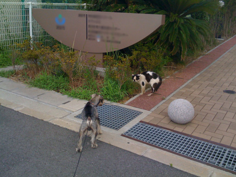 結局がじろーはずっとワンワンしていましたが、こすけは途中で飽きたのか、ニャンコ先生には近づかずにしっこしたり草を食べたり。